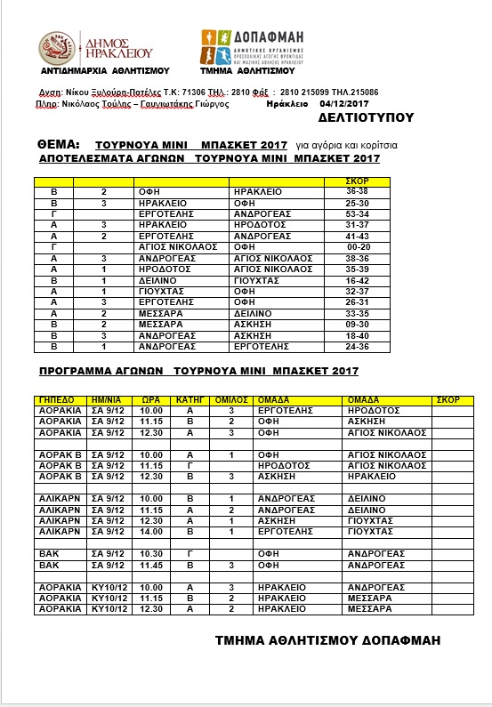 Αποτελέσματα και πρόγραμμα Τουρνουά Μινι Μπάσκετ 2017