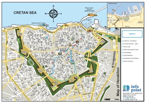 The plateia also contains a wonderful collection of religious icon paintings, housed inside the strong walls of the much older church of Agios Minas, and the Basilica of Agia Ekaterini, (Saint Katherine) built in 1555 and the site of a renowned school of Renaissance painters and writers in the 16th and 17th Centuries. Inside the church can be seen the work of Mikail Damaskinos among other representatives of the Cretan School. The plateia (square) here takes its name from this church, rather than the great cathedral.