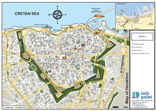 Plateia Kornarou lies at the top of the market, with a lovely Venetian fountain of its own, the Bembo Fountain, probably the oldest, and it bears some very good decoration, although it has ceased to fount. The Bembo Fountain was built in 1588 by Venetian architect Zuanne Bembo. It is decorated with columns, Venetian family coats-of-arms and a headless male statue, brought here from Ierapetra. At one time, people believed that the statue had supernatural powers and, every May, religious rituals were organised in its honour. The atmospheric kafeneio alongside it, still serving Greek coffee and aperitifs from an antique stone pavillion at its centre, is a great reminder of Crete''s Turkish past. The Plateia itself is named after Vitsenzos Kornaros (1553 to approx.1614), composer of the epic poem Erotokritos, which is regularly performed around Crete, and still evokes pride in every Cretan heart. From here, it is close to Agios Minas Cathedral or, in the opposite direction, Freedom Square.