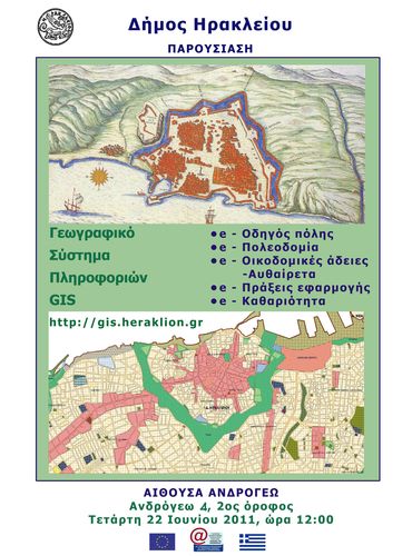 Παρουσίαση του Γεωγραφικού Συστήματος Πληροφοριών του Δήμου Ηρακλείου την Τετάρτη 22 Ιουνίου 2011 και ώρα 12:00 στην αίθουσα Ανδρογέω, οδός Ανδρογέω, αρ. 4, 2ος όροφος.