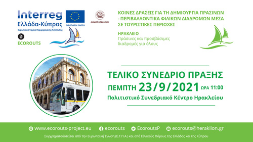 Το Τελικό Συνέδριο της Πράξης «Κοινές Δράσεις για τη δημιουργία πράσινων περιβαλλοντικά φιλικών διαδρομών μέσα σε Τουριστικές Περιοχές» με Ακρωνύμιο «ECORouTs», του Προγράμματος Συνεργασίας INTERREG V-A «ΕΛΛΑΔΑ–ΚΥΠΡΟΣ 2014-2020», πρόκειται να πραγματοποιηθεί στο Πολιτιστικό – Συνεδριακό Κέντρο Ηρακλείου την Πέμπτη 23 Σεπτεμβρίου 2021, με ώρα έναρξης στις 11:00.