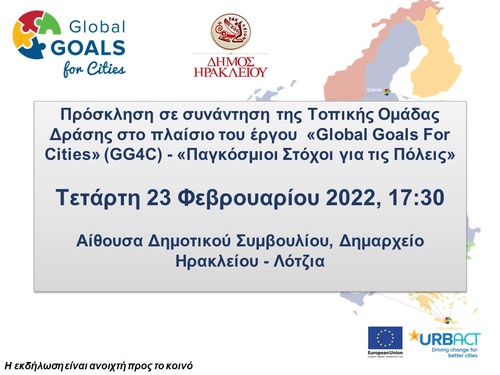 Συνάντηση της Τοπικής Ομάδας Δράσης στο πλαίσιο του έργου  - «Global Goals For Cities» (GG4C) «Παγκόσμιοι Στόχοι για τις Πόλεις» την Τετάρτη 23 Φεβρουαρίου 2022, Ώρα: 17:30 στην Αίθουσα «Ελευθέριος Βενιζέλος», Δημαρχείο Ηρακλείου. Η εκδήλωση είναι ανοιχτή στο κοινό.