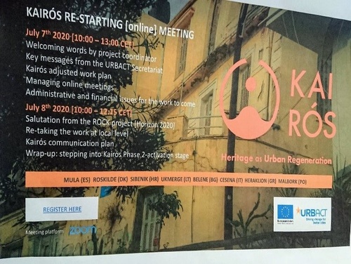 Έχοντας υπόψη τις οδηγίες και τα δεδομένα που ακολουθούν την περίοδο πανδημίας που διανύουμε, το Δίκτυο Συνεργασίας URBACT με τίτλο KAIRÓS «Η πολιτιστική κληρονομιά ως μοχλός αστικής αναζωογόνησης», πραγματοποιήθηκε το ξεκίνημα «Kick-off Meeting” της εγκεκριμένης Β’ Φάσης υλοποίησης του έργου με μια διαδικτυακή συνάντηση μεταξύ των εταίρων στις 7-8 Ιουλίου 2020. Στην συνάντηση συμμετείχαν από την πλευρά του Δήμου Ηρακλείου, η κα Ζαχαρένια Δρόσου, Προϊσταμένη Διεύθυνσης Προγραμματισμού, Οργάνωσης & Πληροφορικής και συντονίστρια της πράξης KAIROS, η κα Μάρθα Παπαδομιχελάκη, στέλεχος του Τμήματος Ευρωπαϊκών Προγραμμάτων και υπεύθυνη επικοινωνίας και η κα Πελαγία Σαββάκη, στέλεχος επίσης του Τμήματος Ευρωπαϊκών Προγραμμάτων και υπεύθυνη οικονομικού αντικειμένου.