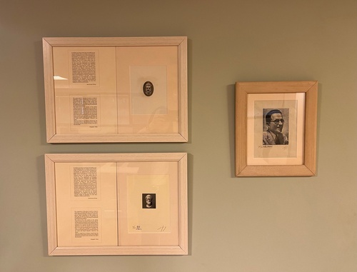 Πρόκειται για μια χαλκογραφία εν αναμονή με την κεφαλή του Αριστοτέλη, μια χαλκογραφία εν αναμονή με την κεφαλή του Αισχύλου και μια ξυλογραφία σε όρθιο ξύλο με την κεφαλή του Ιωάννη Συκουτρή. Τα έργα τα οποία δημιουργήθηκαν προκειμένου να χρησιμοποιηθούν σε χαρτονομίσματα και βρίσκονται σε κατάσταση αναμονής, κοσμούν ήδη το χώρο του Αναγνωστηρίου της Βιβλιοθήκης στο Τμήμα Εσωτερικού Δανεισμού.