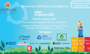 Στις 5 Ιουνίου, Παγκόσμια Ημέρα Περιβάλλοντος, θα πραγματοποιηθεί στις 12 το μεσημέρι στην Πειραματική Σκηνή του Πολιτιστικού Συνεδριακού Κέντρου Ηρακλείου η τελετή βράβευσης των σχολείων που έλαβαν μέρος στον μαραθώνιο Ανακύκλωσης και στον εικαστικό διαγωνισμό με έργα από χρησιμοποιημένα ρούχα που διοργανώνει η Αντιδημαρχία Καθαριότητας, Περιβάλλοντος και Ενέργειας του Δήμου Ηρακλείου.
