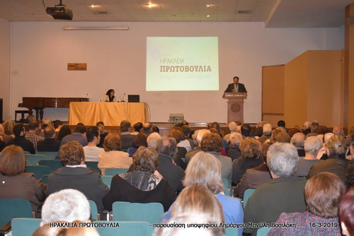 Στην κατάμεστη αίθουσα «Μανόλης Καρέλλης» του δημοτικού κτηρίου της οδού Ανδρόγεω έγινε το Σάββατο 16 Μαρτίου η παρουσίαση της υποψηφιότητας του υποψήφιου Δημάρχου της Ηράκλειας Πρωτοβουλίας κ. Μανόλη Βασιλάκη.