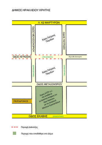 Επίσης άμεσα, σε συνεργασία με το Δυτικό Δημοτικό Διαμέρισμα και αφού εκδοθούν οι σχετικές άδειες, θα οριστεί η ημερομηνία κατεδάφισης και του τμήματος το οποίο έχει αποδοθεί στον Δήμο Ηρακλείου, (σκιαγραφημένο τμήμα του διαγράμματος), συνολικής έκτασης 4.679 τ.μ., στο οποίο θα δημιουργηθούν αθλητικές υποδομές.