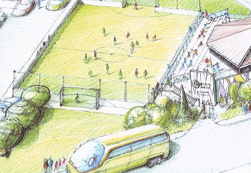 Πιο συγκεκριμένα όπως φαίνεται και στο συνημμένο σκαρίφημα, θα κατασκευαστεί ένα γήπεδο ποδοσφαίρου 8Χ8, με τεχνητό χλοοτάπητα, αποδυτήρια, παιδική χαρά, χώροι στάθμευσης και χώροι δεντροφύτευσης .