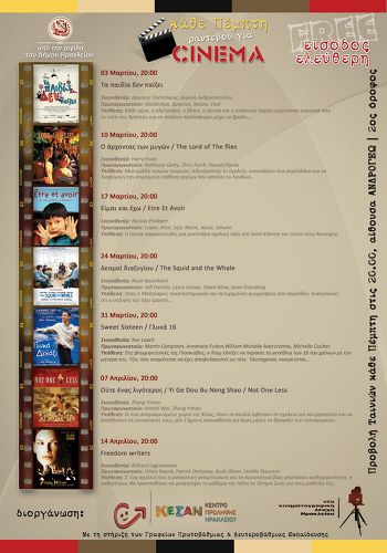 Το ΚΕΣΑΝ, Κέντρο Πρόληψης Εξαρτησιογόνων ουσιών σε συνεργασία με τη Νέα Κινηματογραφική Λέσχη Ηρακλείου, διοργανώνει πρόγραμμα προβολής ταινιών, υπό την αιγίδα του Δ. Ηρακλείου, με τη στήριξη των Γραφείων Σχολικών Δραστηριοτήτων Πρωτοβάθμιας και Δευτεροβάθμιας Εκπαίδευσης Ν. Ηρακλείου.
