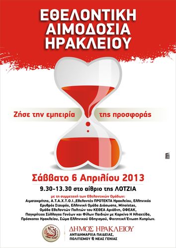 Με χαρά σας προσκαλούμε στην Εθελοντική Αιμοδοσία που θα πραγματοποιηθεί το Σάββατο 6 Απριλίου 2013 στο κέντρο της πόλης του Ηρακλείου (Λότζια) και ώρες 09.30 – 13.30.