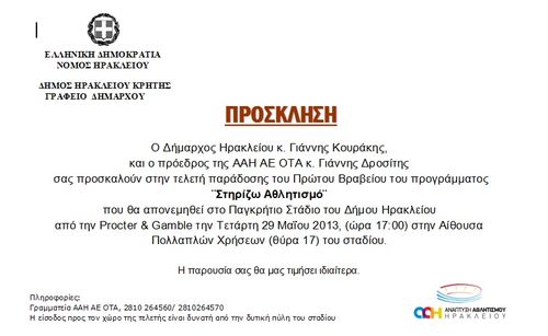 Το πρώτο βραβείο για το πρόγραμμα "Στηρίζω τον Αθλητισμό" θα απονεμηθεί στο Παγκρήτιο Στάδιο την Τετάρτη 29 Μαϊου 2013 στις 17:00 στην αίθουσα πολλαπλών χρήσεων του Σταδίου.