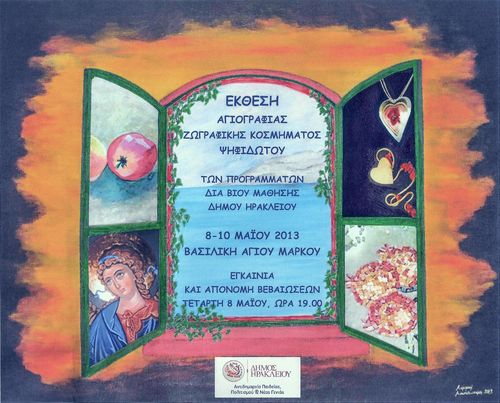 Η έκθεση θα είναι ανοικτή για το κοινό από 9:00-13:30 και από 18:00-21:00 από 8 έως 10 Μαΐου στην Βασιλική Αγίου Μάρκου θα περιλαμβάνει τα έργα όλων των συμπολιτών μας στις τέχνες της Ζωγραφικής, Αγιογραφίας, Ψηφιδωτού και Κοσμήματος που δημιουργήθηκαν στο πλαίσιο των Προγραμμάτων Δια Βίου Μάθησης του Δήμου Ηρακλείου.