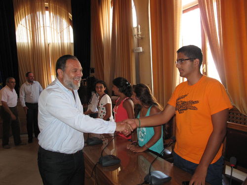 Τους μαθητές υποδέχτηκαν στην αίθουσα συνεδριάσεων του Δημοτικού Συμβουλίου Ηρακλείου «Ελ. Βενιζέλος» ο Δήμαρχος Ηρακλείου κ. Γιάννης Κουράκης και οι αντιδήμαρχοι κ. κ. Νίκος Γιαλιτάκης και Βαγγέλης Σισαμάκης.