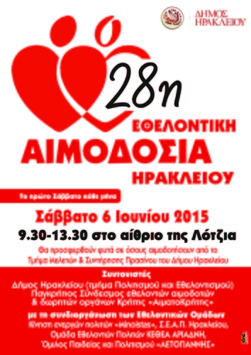 Σας προσκαλούμε στην Εθελοντική Αιμοδοσία που θα πραγματοποιηθεί το Σάββατο   6.6.2015 στο κέντρο της πόλης του Ηρακλείου, (στο Αίθριο της Λότζια)   και ώρες 09:30 – 13:30. Πρόκειται για μια κοινή προσπάθεια αιμοδοσίας εθελοντικών σωματείων και οργανώσεων του Ηρακλείου, την οποία συντονίζουν: