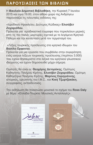 Η Βικελαία Δημοτική Βιβλιοθήκη, την Κυριακή 7 Ιουνίου 2015 και ώρα 19.00, στον αίθριο χώρο της Ανδρόγεω παρουσιάζει τις τελευταίες εκδόσεις της:
