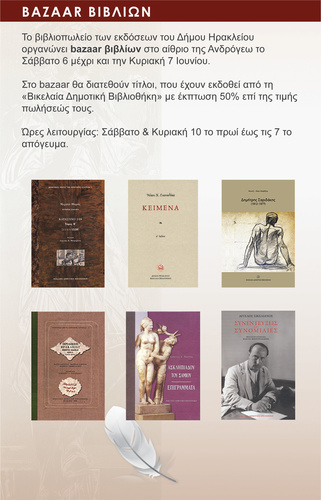 To βιβλιοπωλείο των εκδόσεων του Δήμου Ηρακλείου οργανώνει bazaar βιβλίων στο αίθριο της Ανδρόγεω το Σάββατο 6 μέχρι και την Κυριακή 7 Ιουνίου.