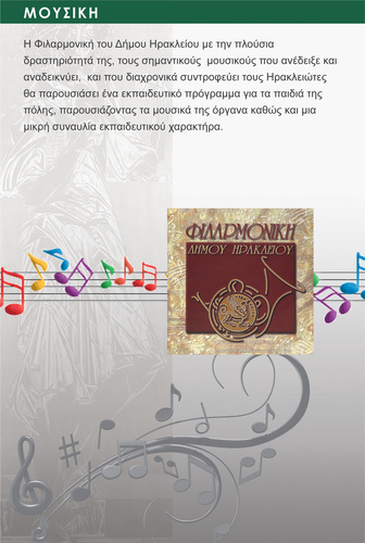 Η Φιλαρμονική του Δήμου Ηρακλείου με την πλούσια δραστηριότητα της, τους σημαντικούς μουσικούς που ανέδειξε και αναδεικνύει, και που διαχρονικά συντροφεύει τους Ηρακλειώτες θα παρουσιάσει ένα εκπαιδευτικό πρόγραμμα για τα παιδιά της πόλης, παρουσιάζοντας τα μουσικά της όργανα καθώς και μια μικρή συναυλία εκπαιδευτικού χαρακτήρα.