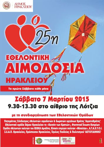 Σας προσκαλούμε στην Εθελοντική Αιμοδοσία που θα πραγματοποιηθεί το Σάββατο 7 Μαρτίου 2015 στο κέντρο της πόλης του Ηρακλείου, (στο Αίθριο της Λότζια) και ώρες 09:30- 13:30.