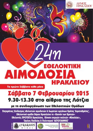Σας προσκαλούμε στην Εθελοντική Αιμοδοσία που θα πραγματοποιηθεί το Σάββατο                       7 Φεβρουαρίου 2015 στο κέντρο της πόλης του Ηρακλείου, (στο Αίθριο της Λότζια) και ώρες   10:00- 13:30.