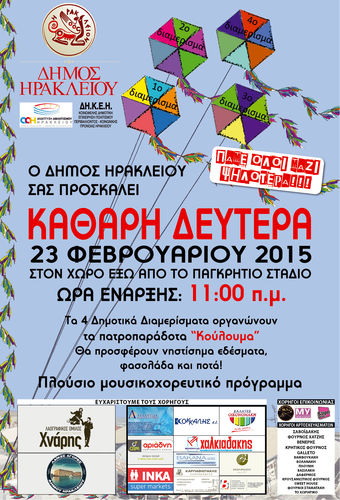 Οι 1η ,2η, 3η και 4η Δημοτικές Κοινότητες Ηρακλείου διοργανώνουν κοινό παραδοσιακό εορτασμό της Καθαράς Δευτέρας «Κούλουμα 2015» στο χώρο του Παγκρητίου Σταδίου στη περιοχή Λίντο στις 23 Φεβρουαρίου 2015 με καλλιτεχνικό πρόγραμμα και παραδοσιακά εδέσματα .