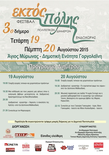 Ξεκινά σήμερα, Τετάρτη 19 Αυγούστου, το 3ο Διήμερο Φεστιβάλ Προβολής και Προώθησης Τοπικών Προϊόντων που διοργανώνει η Κοινωφελής Δημοτική Επιχείρηση Πολιτισμού, Περιβάλλοντος, Κοινωνικής Πρόνοιας του Δήμου Ηρακλείου θα πραγματοποιηθεί στον Άγιο Μύρωνα (Δημοτική Ενότητα Γοργολαΐνη).