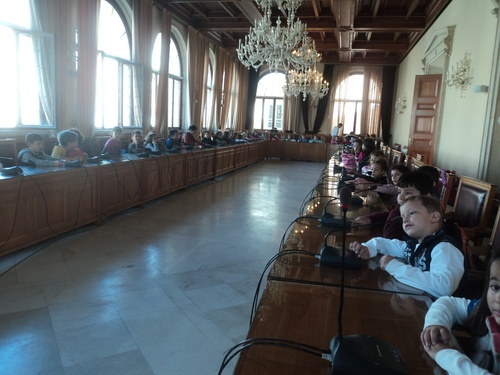 Τα παιδιά εντυπωσιάστηκαν από την αίθουσα του Δημοτικού Συμβουλίου και κάθισαν στα έδρανα των δημοτικών συμβούλων ακούγοντας με προσοχή τους τρόπους λειτουργίας της Τοπικής Αυτοδιοίκησης από την Αντιδήμαρχο Παιδείας, Διά Βίου Μάθησης, Νέας Γενιάς και Καινοτομίας κ. Μαρία Καναβάκη.