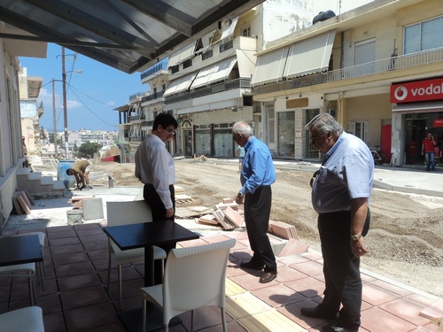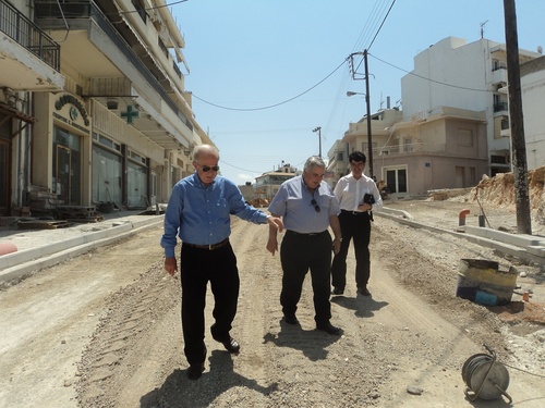 Ο Δήμαρχος Ηρακλείου αρχικά επισκέφθηκε το εργοτάξιο της οδού Γερωνυμάκη και συνομίλησε με τους επιχειρηματίες της περιοχής και με τους κατοίκους καθώς και τον υπεύθυνο του εργοταξίου για την εξέλιξη του έργου.