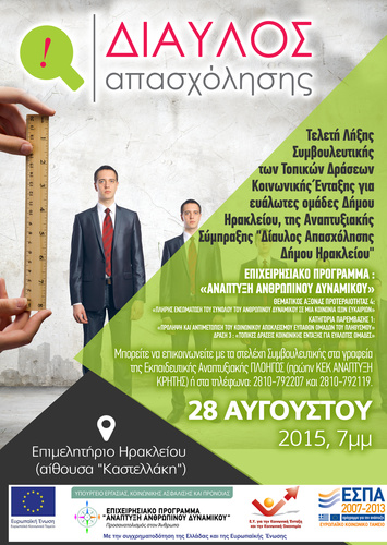 Ολοκληρώνονται τη Δευτέρα 31 Αυγούστου οι Τοπικές Δράσεις Κοινωνικής Ένταξης για ευάλωτες ομάδες Δήμου Ηρακλείου της Αναπτυξιακής Σύμπραξης «Δίαυλος Απασχόλησης Δήμου Ηρακλείου». Στο πλαίσιο του προγράμματος 100 άνεργοι κάτοικοι του Δήμου Ηρακλείου από ευπαθείς ομάδες του πληθυσμού έλαβαν ολοκληρωμένη στήριξη, μέσα από δράσεις συμβουλευτικής και κατάρτισης, και οι 28 απ’ αυτούς έχουν αποκατασταθεί επαγγελματικά.