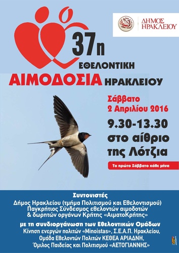 Εθελοντική Αιμοδοσία θα πραγματοποιηθεί το Σάββατο 2.04.2016 στο κέντρο της πόλης του Ηρακλείου, (στο Αίθριο της Λότζια) και ώρες 09:30 – 13:30. Πρόκειται για μια κοινή προσπάθεια αιμοδοσίας εθελοντικών σωματείων και οργανώσεων του Ηρακλείου, την οποία συντονίζουν:
