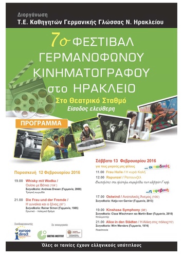 Η Τοπική Επιτροπή Ηρακλείου της Πανελλήνιας Ένωσης Καθηγητών Γλώσσας Π.Ε. σε συνεργασία με το Europe Direct της Περιφέρειας Κρήτης και το Ινστιτούτο Goethe Αθηνών υπό την αιγίδα του Δήμου Ηρακλείου και την Αντιδημαρχία Παιδείας, Δια Βίου Μάθησης, Νέας Γενιάς και Καινοτομίας, διοργανώνουν για 7η συνεχόμενη χρονιά το Φεστιβάλ Γερμανόφωνου Κινηματογράφου στο Θεατρικό Σταθμό Ηρακλείου.