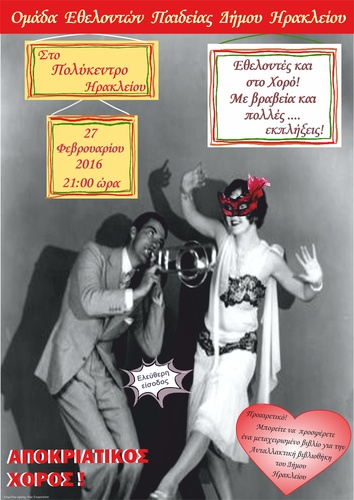 Το δικό της αποκριάτικο χορό διοργανώνει η Ομάδα Εθελοντών Παιδείας του Δήμου Ηρακλείου,το Σάββατο 27 Φεβρουαρίου και ώρα 21:00 στο Πολύκεντρο Ηρακλείου.