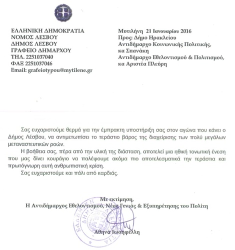 Η Αντιδήμαρχος Λέσβου ευχαρίστησε τον Δήμο Ηρακλείου για την έμπρακτη υποστήριξή του στον αγώνα που κάνει ο Δήμος Λέσβου, για να αντιμετωπίσει το τεράστιο βάρος της διαχείρισης των πολύ μεγάλων μεταναστευτικών ροών.