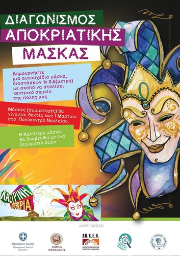 Ο Δήμος Ηρακλείου, η Περιφέρεια Κρήτης, η ΔΗΚΕΗ, οι Ομάδες του Κυνηγιού κρυμμένου θησαυρού και ο Εμπορικός Σύλλογος στα πλαίσια των εκδηλώσεων της «Καστρινής Αποκριάς 2016» προσκαλούν: συλλόγους, σχολεία, οργανισμούς και εθελοντικές ομάδες στον «Διαγωνισμό Αποκριάτικης Μάσκας»!