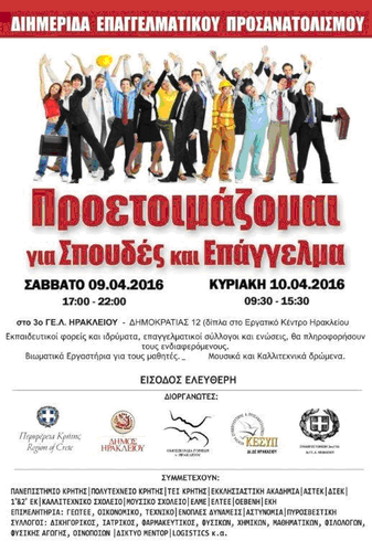 Το ΚΕ.ΣΥ.Π. Ηρακλείου θα πραγματοποιήσει το Σάββατο 9 Απριλίου 17:00 – 22:00 και την Κυριακή 10 Απριλίου 2016 09:30 – 15:30, ανοικτή Διημερίδα Επαγγελματικού Προσανατολισμού με θέμα «Προετοιμάζομαι για Σπουδές και Επάγγελμα» στο 3ο ΓΕ.Λ. Ηρακλείου.