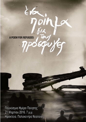 Στο πλαίσιο της πανελλήνιας εκδήλωσης που διοργανώνει και συντονίζει ο «Κύκλος των Ποιητών» με τίτλο: «Ένα ποίημα για τους πρόσφυγες» θα πραγματοποιηθούν εκδηλώσεις την 21η Μαρτίου που είναι η Παγκόσμια Ημέρα Ποίησης, σε 30 πόλεις της Ελλάδας. Συνδιοργανωτής είναι η Ύπατη Αρμοστεία για τους Πρόσφυγες του ΟΗΕ και ο ιστότοπος https://www.facebook.com/ Refugees WelcomeGR/ publishing_tools. Η Ελλάδα, κατεξοχήν χώρα των ποιητών, μέσω της ποίησης, θα καταδείξει και την ουμανιστική της πλευρά.