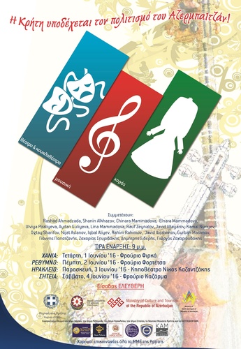 Σήμερα, η εκδήλωση που θα παρακολουθήσομε έχει ένα ιδιαίτερο ενδιαφέρον : Αποτελεί έναν διάλογο ανάμεσα στους πολιτισμούς των δύο χωρών. Το μακρινό Αζερμπαϊτζάν θα συνομιλήσει μέσα από τη μουσική, τον χορό και το τραγούδι με την Κρήτη. Ο Καύκασος με τη Μεσόγειο θα συναντηθούν απόψε σε μια μαγική μουσική και χορευτική βραδιά. Θα δούμε τις διαφορές και τα κοινά ανάμεσα στους δύο πολιτισμούς, τον πολιτισμό της θάλασσας και τον πολιτισμό του βουνού με ύψος 5.749 μέτρα πάνω από την επιφάνεια της θάλασσας.»