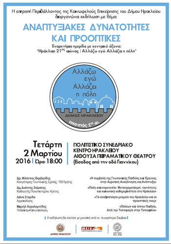 «Αναπτυξιακές δυνατότητες και προοπτικές» είναι το θέμα ημερίδας που θα πραγματοποιηθεί την Τετάρτη 2 Μαρτίου 2016 και ώρα 18:00 στην Αίθουσα του Πειραματικού Θεάτρου του Πολιτιστικού Συνεδριακού Κέντρου Ηρακλείου (Είσοδος από την οδό «Γιαννίκου»).