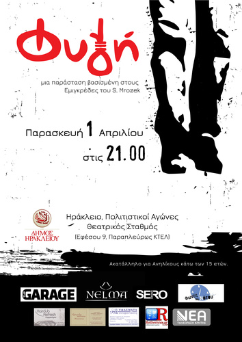 Συνεχίζεται το ΦΕΣΤΙΒΑΛ ΘΕΑΤΡΟΥ με το έργο «Φυγή» μια παράσταση βασισμένη στους Εμιγκρέδες του Σ. Μρόζεκ, από την ομάδα THE GARAGE, την Παρασκευή 1, Απριλίου, στο Θεατρικό Σταθμό, ώρα, 21:00 με γενική είσοδος 10€, (δεκτές ατέλειες ΣΕΗ και Θεατρολόγων),στο πλαίσιο των «ΠΟΛΙΤΙΣΤΙΚΩΝ ΑΓΩΝΩΝ 2016» που οργανώνει ο Δήμος Ηρακλείου.
