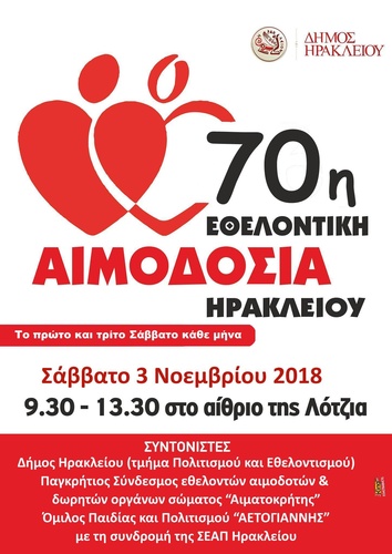 O Δήμος Ηρακλείου με την Αντιδημαρχία Πολιτισμού - Εθελοντισμού και ο Παγκρήτιος Σύνδεσμος Εθελοντών Αιμοδοτών και Δωρητών Οργάνων Σώματος «Αιματοκρήτης» με την πολύτιμη συνδρομή του Ομίλου Παιδείας και Πολιτισμού «ΑΕΤΟΓΙΑΝΝΗΣ» και της Σ.Ε.Α.Π. Ηρακλείου.