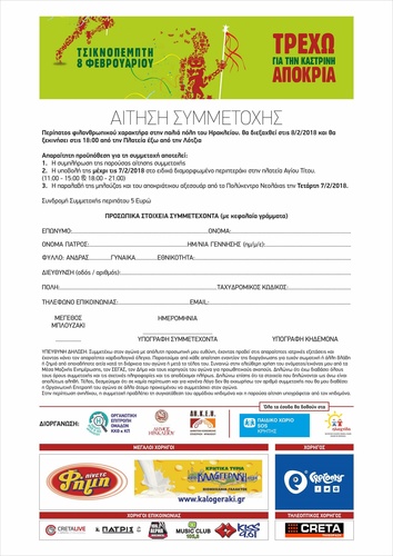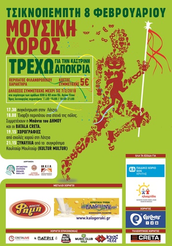 Έτσι την Τσικνοπέμπτη (8 Φεβρουαρίου) στις 18:00 θα πραγματοποιηθεί η εκδήλωση «Τρέχω για την Καστρινή Αποκριά» από την Οργανωτική Επιτροπή Ομάδων Κ.Κ.Θ. και Κ.Π. με τη στήριξη του Δήμου. Πρόκειται για έναν περίπατο φιλανθρωπικού χαρακτήρα μέσα στην πόλη με αφετηρία την Ενετική Λότζια. Αμέσως μετά θα ακολουθήσει συναυλία στο κέντρο της πόλης, στους ρυθμούς του καρναβαλιού. Όσοι θέλουν να δηλώσουν συμμετοχή για την Τσικνοπέμπτη «Τρέχω για την Καστρινή Αποκριά» λειτουργεί περίπτερο στην Πλατεία του Αγίου Τίτου καθημερινά 11:00 -15:00 και 18:00-21:00.