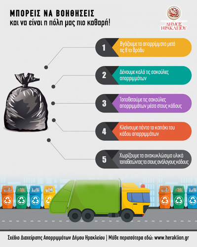 Στο πλαίσιο της απαραίτητης συνεργασίας της Υπηρεσίας Καθαριότητας με τους δημότες, ο Δήμος Ηρακλείου, ενημερώνει ότι η απόθεση των απορριμμάτων στους κάδους πρέπει να γίνεται μετά τις οκτώ το βράδυ.
