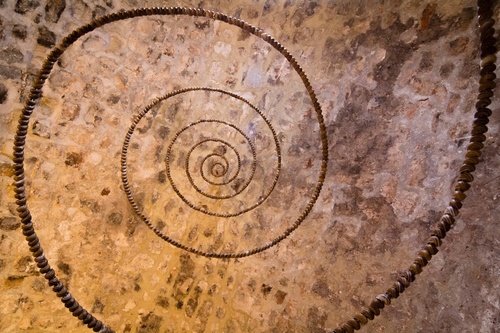 Με τον τίτλο «Κοχλίας», η εικαστικός Άννα Σαλούστρου παρουσιάζει μια σειρά από εγκαταστάσεις σε σχήμα σπείρας, βέλους, DNA, σείστρου κ.ά. κατασκευασμένες από όστρακα σαλιγκαριών περασμένα σε ατσαλόσυρμα και πετονιά (5.000 όστρακα).