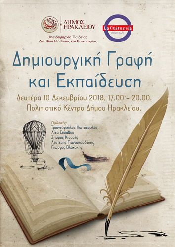 Ο Δήμος Ηρακλείου, δια της Αντιδημαρχίας Παιδείας, Δια Βίου Μάθησης και Καινοτομίας, και το «Σωματείο δημιουργικής γραφής LaCulturelá» διοργανώνουν ημερίδα με τίτλο «Δημιουργική Γραφή και Εκπαίδευση», την Δευτέρα 10 Δεκεμβρίου 2018 στις 17:00 στην αίθουσα Πειραματικού Θεάτρου του Πολιτιστικού Συνεδριακού Κέντρου Ηρακλείου. Στόχος της ημερίδας είναι η ενημέρωση και επαφή κοινού και εκπαιδευτικών με το αντικείμενο της δημιουργικής γραφής και το ρόλο που μπορεί να παίξει στην εκπαίδευση διάφορων βαθμίδων.