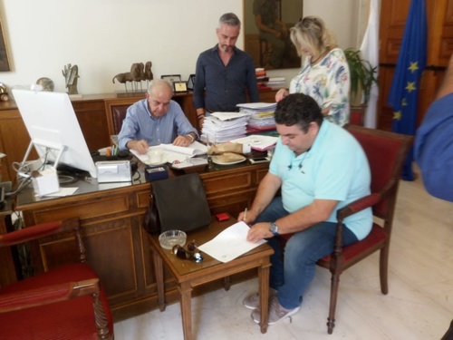 Υπεγράφη σήμερα, Τετάρτη 12 Σεπτεμβρίου στην Λότζια η σύμβαση για «Διανοίξεις και κατασκευή μικρών τεχνικών έργων». Την σύμβαση υπέγραψε ο Δήμαρχος Ηρακλείου Βασίλης Λαμπρινός με τον εκπρόσωπο της αναδόχου εταιρίας, παρουσία του αντιδημάρχου Τεχνικών Έργων Γιάννη Αναστασάκη.