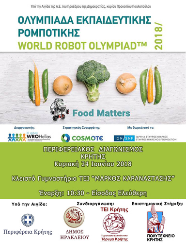 Ξεκινά την Κυριακή 24 Ιουνίου στο Ηράκλειο ο 1ος Περιφερειακός Διαγωνισμός Κρήτης της Ολυμπιάδας Εκπαιδευτικής Ρομποτικής WRO™ 2018. Οι ομάδες της Κρήτης θα διαγωνιστούν για μια θέση στον τελικό που θα πραγματοποιηθεί στην Αθήνα την 1η Ιουλίου 2018. Ο Διαγωνισμός θα διεξαχθεί στο Κλειστό Γυμναστήριο του ΤΕΙ Κρήτης «Μάρκος Καραναστάσης» και θα ξεκινήσει στις 10:30 το πρωί.