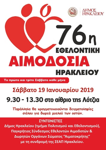 Εθελοντική Αιμοδοσία θα πραγματοποιηθεί το Σάββατο 19.01.2019 στο κέντρο της πόλης του Ηρακλείου (στο Αίθριο της Λότζια), και ώρες 10:00 – 13:30. Πρόκειται για μια κοινή προσπάθεια αιμοδοσίας, την οποία συντονίζουν: