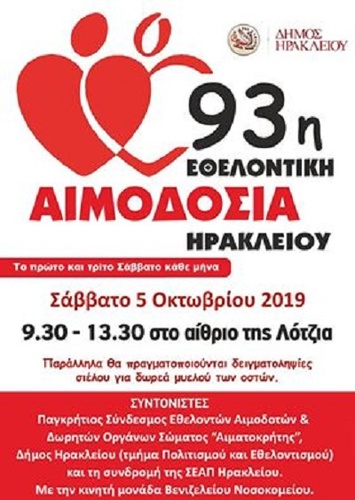 Εθελοντική Αιμοδοσία θα πραγματοποιηθεί το Σάββατο 05.10.2019 στο κέντρο της πόλης του Ηρακλείου (στο Αίθριο της Λότζια), και ώρες 09:30 – 13:30. Πρόκειται για μια κοινή προσπάθεια αιμοδοσίας, την οποία συντονίζουν: