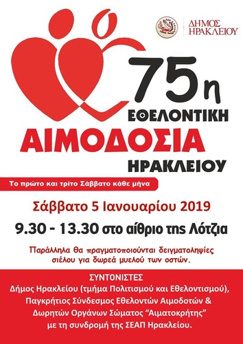 Εθελοντική Αιμοδοσία θα πραγματοποιηθεί το Σάββατο 05.01.2019 στο κέντρο της πόλης του Ηρακλείου (στο Αίθριο της Λότζια), και ώρες 10:00 – 13:30. Πρόκειται για μια κοινή προσπάθεια αιμοδοσίας, την οποία συντονίζουν: