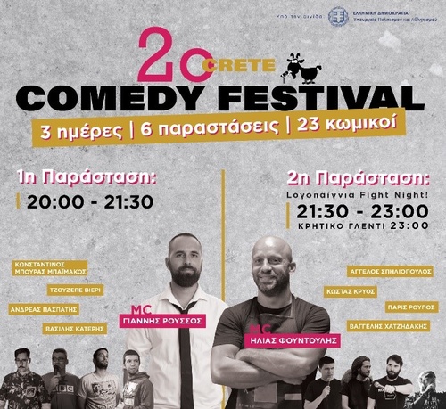 Την Τετάρτη 22, Πέμπτη 23 και Παρασκευή 24 Σεπτεμβρίου στο Κηποθέατρο «Μάνος Χατζιδάκις» μπορείτε να απολαύσετε κατά αλφαβητική σειρά τους Blink Mike και GiuseppeVieri, τον Βασίλη Κατέρη, τον Παναγιώτη Κούδα, τον Κώστα Κρύο, τον Κωνσταντίνο Μπούρα Μπαϊμάκο και τον Πάρη Ρούπο, την Δήμητρα Νικητέα, τους Αλέξανδρο Πασπαρδάνη και Αντρέα Πασπάτη, τον Νέστορα Κωνσταντίνο Ραβνιωτόπουλο, τον Άγγελο Σπηλιόπουλο και τον Γιάννη Ρούσσο, τον Αλέξανδρο Τιτκώβ, τον Σπήλιο Φλώρο, τον Ηλία Φουντούλη, τον Δημήτρη Χριστοδούλου και τον Δημήτρη Χριστοφορίδη. Επίσης θα παίξουν τα μέλη των Stand Up Cretan Comedians (Στέλιος Ανδρεαδάκης, Χρήστος Μακαριάδης, Βαγγέλης Χατζηδάκης και Δημήτρης Χοντίδης).