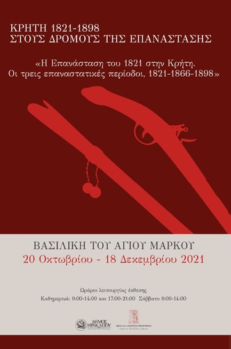 Ξεκινά την Τετάρτη 20 Οκτωβρίου 2021 στη Βασιλική του Αγίου Μάρκου η Έκθεση «Κρήτη 1821-1898: Στους δρόμους της Επανάστασης» που διοργανώνει ο Δήμος Ηρακλείου και η Βικελαία Δημοτική Βιβλιοθήκη στο πλαίσιο των εορτασμών για τα διακόσια χρόνια από την Εθνεγερσία του 1821. Πρόκειται για μία σημαντική έκθεση με κειμήλια των Αγώνων του Κρητικού λαού κατά των Οθωμανών, ντοκουμέντα και στοιχεία. Η Έκθεση αυτή αναφέρεται σε τρεις αιματηρές επαναστάσεις που έγιναν στην Κρήτη (1821, 1866, 1897) και περιλαμβάνει αντικείμενα από τις ιδιωτικές συλλογές των Γεωργίου Μπαλαφούτη, Δημήτρη Σκαρτσιλάκη, Ευτύχη Τζιρτζιλάκη και από τις συλλογές του Εθνικού Ιστορικού Μουσείου στην Αθήνα και της Ιεράς Μονής Αρκαδίου.